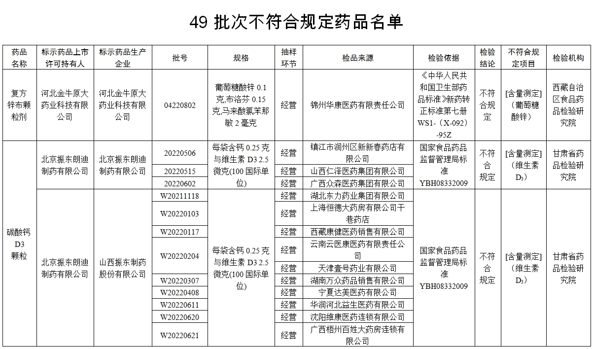 一、经西藏自治区食品药品检验研究院检验,标示为河北金牛原大药业科技有限公司生产的1批次复方锌布颗粒剂不符合规定,不符合规定项目为含量测定。