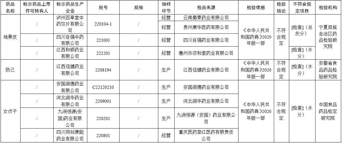 经宁夏回族自治区药品检验研究院检验,标示为泸州百草堂中药饮片有限公司、四川自强中药有限公司、江西和硕药业有限公司生产的3批次地骨皮不符合规定,不符合规定项目包括总灰分、水分。