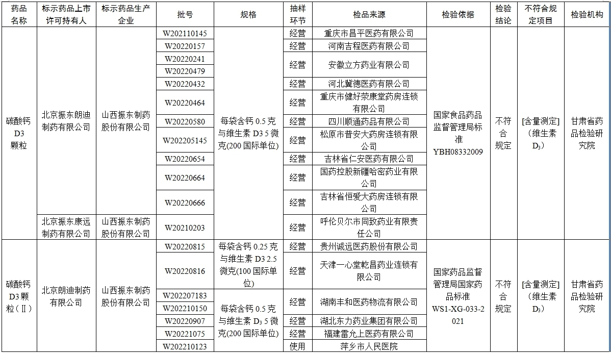 经甘肃省药品检验研究院检验,标示为北京振东朗迪制药有限公司、北京振东朗迪制药有限公司委托山西振东制药股份有限公司、北京振东康远制药有限公司委托山西振东制药股份有限公司生产的24批次碳酸钙D3颗粒不符合规定,不符合规定项目均为含量测定。