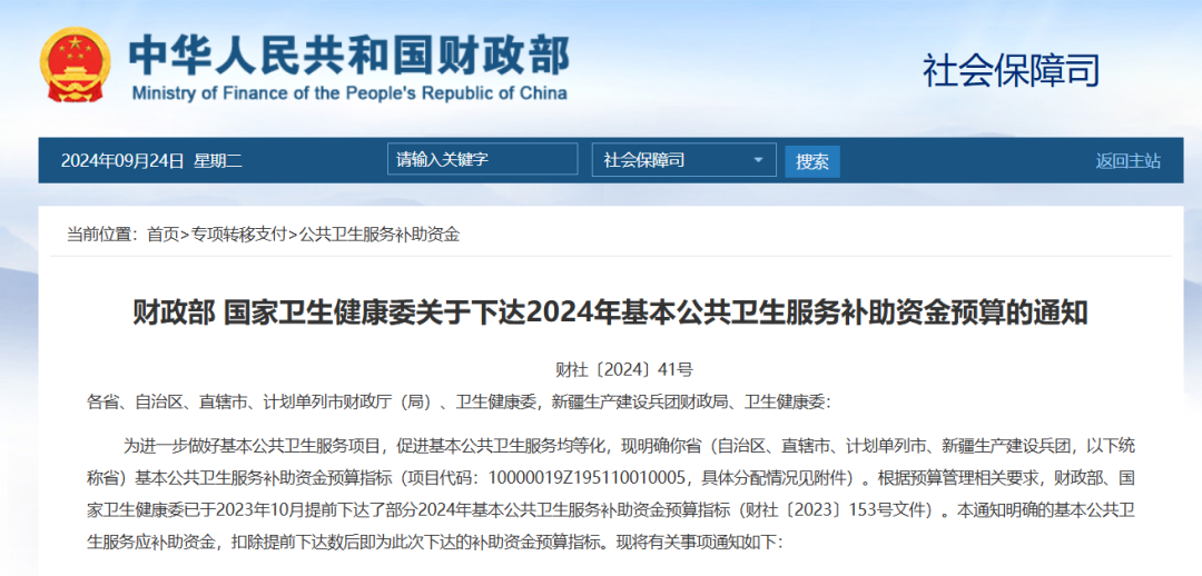 今年6月,据国家财政部网站公布,财政部、国家卫健委联合下发《关于下达2024年基本公共卫生服务补助资金预算的通知》。