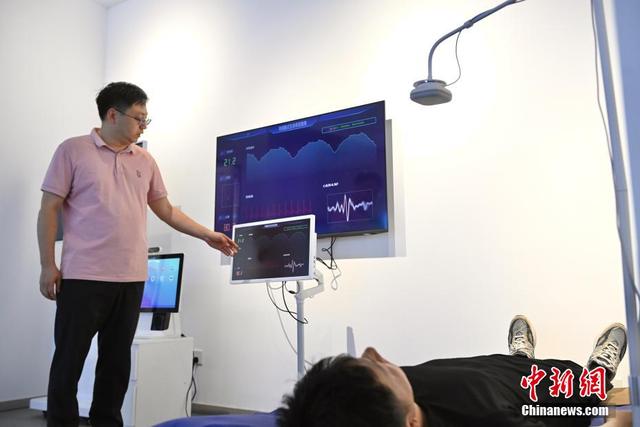 中新社记者 韩苏原 摄 5月14日,研发人员正在演示非接触式心脏健康监测系统。近日,中国科学技术大学团队研发出“非接触式心脏健康监测技术及应用”。用户仅需躺在床上,借助悬在胸腔上方的传感器,就能完成心脏健康监测。与传统心电监测设备不同,系统无需通过导联线和电极片与躯体相连,在几秒钟到几分钟内,即可实现“隔空测心”。该技术不仅能够高精度地监测心血管健康,还能通过多模态数据分析评估中风风险,为健康管理带来了全新的可能性。