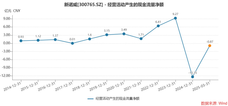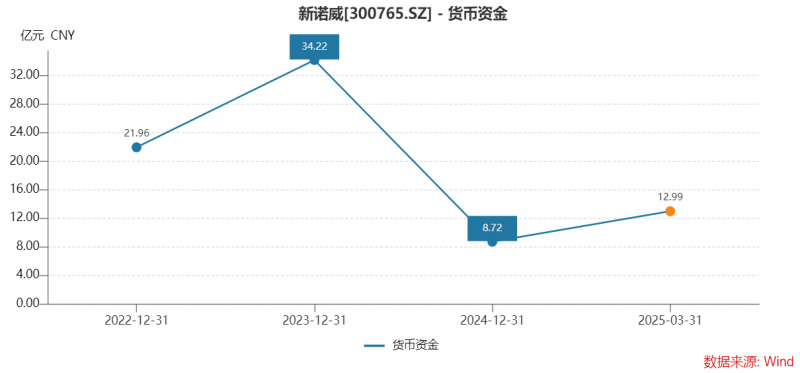 不仅如此,新诺威的货币资金正在急速下降。到2025年第一季度仅12.99亿元,相比2023年的高点减少了21.23亿元。