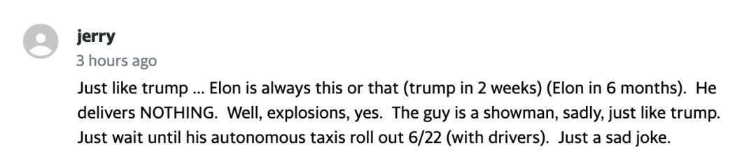 另一位网友说:“马斯克就像特朗普一样……总是这样或那样的吹。他什么都没做到。好吧,爆炸性的东西,是的。可悲的是,这家伙是个爱表演的人,就像特朗普一样。等着看他的自动驾驶出租车6月22日上市吧。真是个可悲的笑话。”