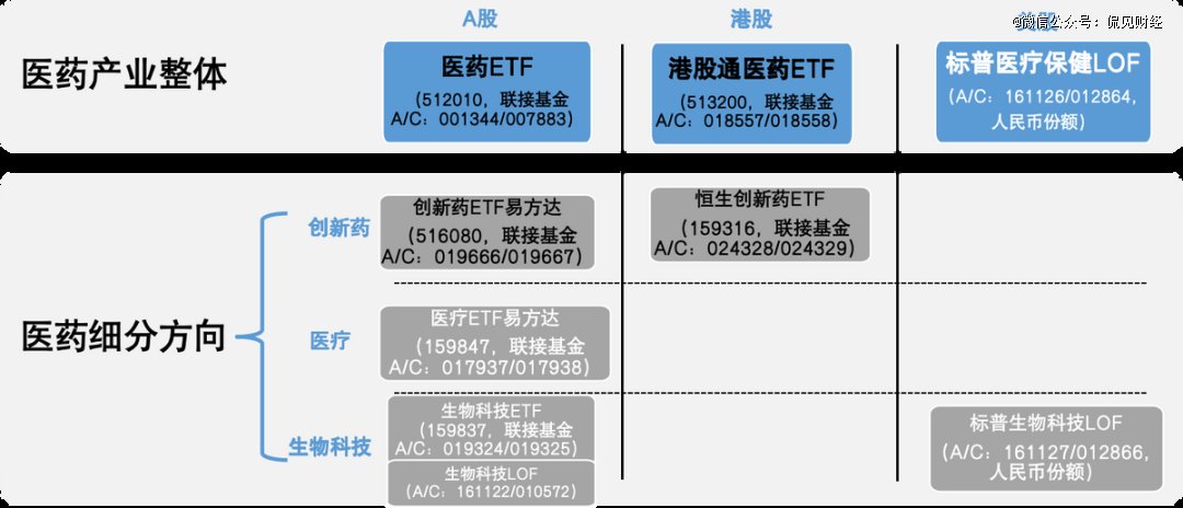 例如,医药ETF(512010,联接基金A/C:001344/007883)聚焦A股医药卫生行业龙头,全面覆盖化学制药、医疗服务、医疗器械等未来健康产业细分环节,目前产品规模超200亿元、位居同标的ETF第 一;港股通医药ETF(513200,联接基金A/C:018557/018558)则聚焦港股通范围内的医药卫生行业龙头,包含创新药、医疗器械、医疗服务等关键领域,产品最新规模超20亿元、在同标的ETF中居首。